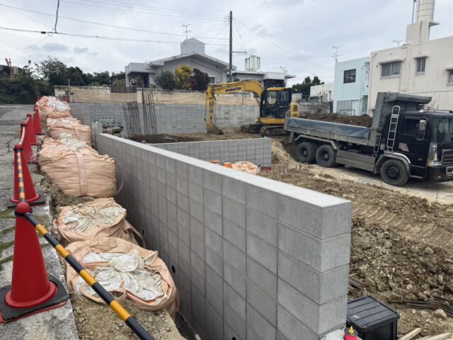 沖縄支店の現場、造成〜ブロック工事をコツコツ進めてます💪 掘って、組んで、積んで。重機も人の手もフル稼働🔥高低差や地盤を…